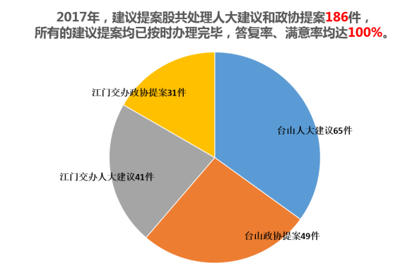(八)做好人大建議和政協提案辦理工作。2017年,建議提案股共處理人大建議和政協提案186件。其中,臺山市人大建議65件,政協提案49件;江門市交辦的人大建議41件,政協提案31件。在江門市交辦的建議提案中,省人大建議1件、江門市人大建議28件、江門市閉會人大建議3件、江門市走訪代表建議9件,省政協提案1件、江門市政協提案30件。所有的建議提案均已按時辦理完畢,答復率、滿意率均達100%。