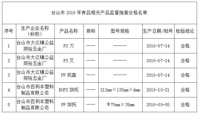 根據(jù)《中華人民共和國(guó)產(chǎn)品質(zhì)量法》、《中華人民共和國(guó)食品安全法》以及《產(chǎn)品質(zhì)量監(jiān)督抽查管理辦法》等法律法規(guī)的規(guī)定,我局現(xiàn)將臺(tái)山市2016年食品相關(guān)產(chǎn)品市級(jí)監(jiān)督抽查結(jié)果予以公告。