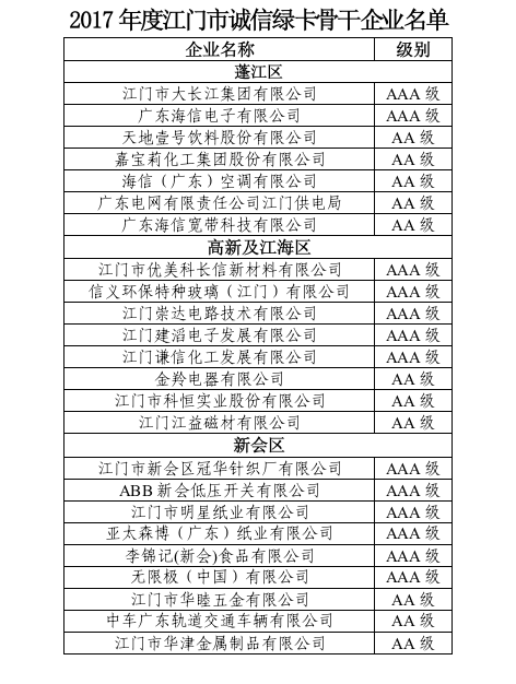 日前,市經(jīng)信局公示了2017年度誠(chéng)信綠卡骨干企業(yè)名單,授予大長(zhǎng)江、海信、天地壹號(hào)、嘉寶莉等44家企業(yè)2017年度江門(mén)市誠(chéng)信綠卡骨干企業(yè)稱(chēng)號(hào)。這些企業(yè)將享受到政府“真金白銀”的資金扶持和相關(guān)職能部門(mén)的主動(dòng)服務(wù)。
