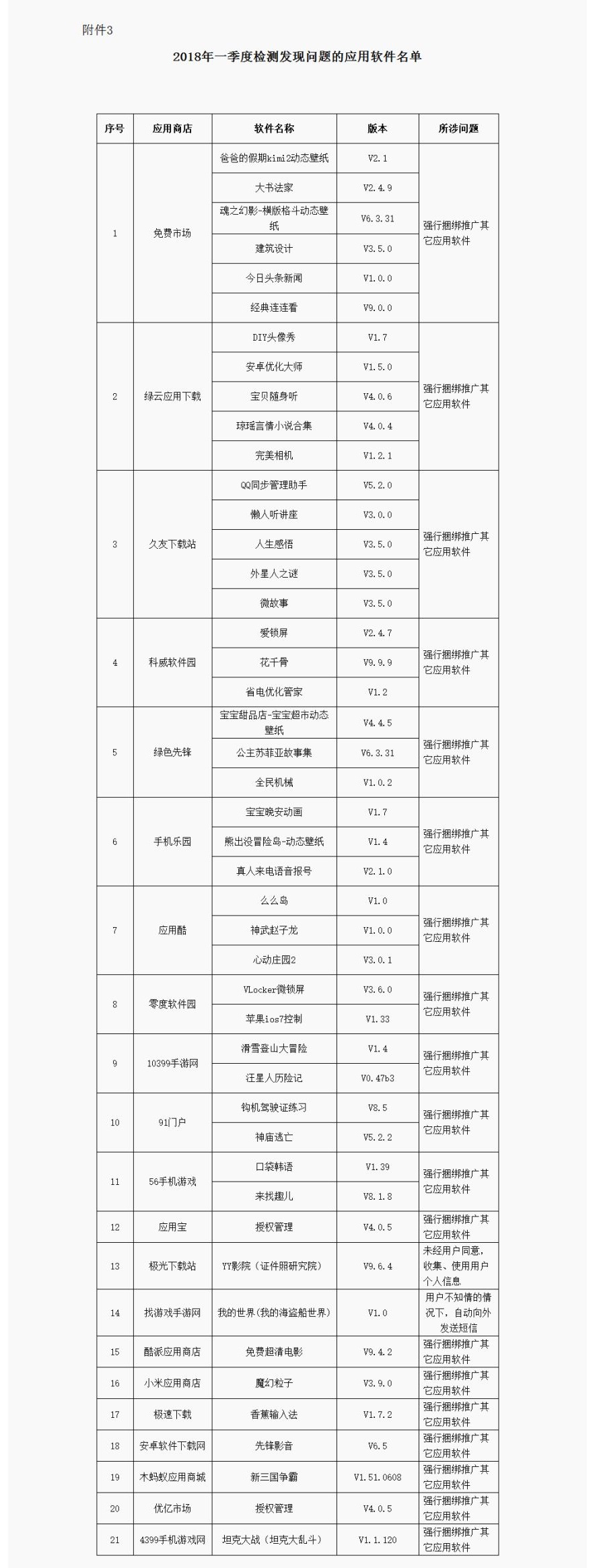 日前,工信部發布2018年一季度檢測發現問題的應用軟件名單,共涉及21個應用商店,46款APP。
