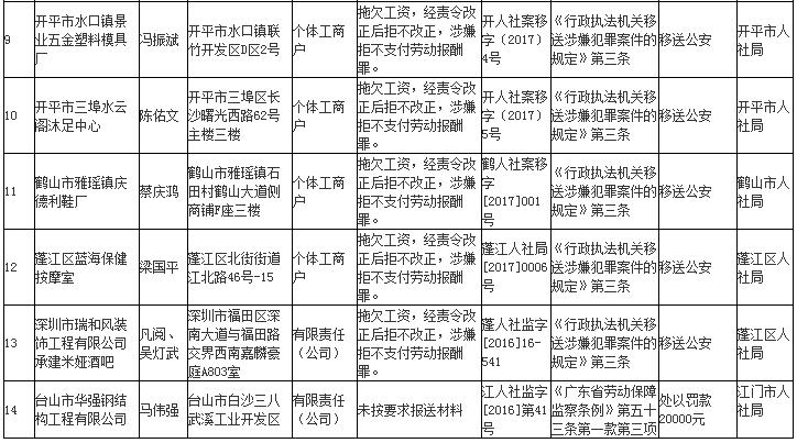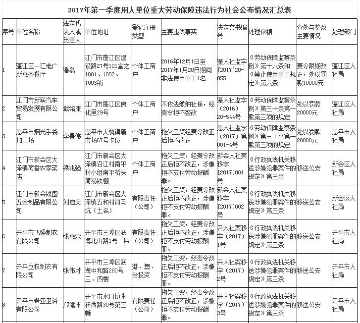 今年第一季度,江門市人力資源社會保障行政部門繼續加大對欠薪等重大違法行為的打擊力度,各地特別是蓬江區、新會區、開平市等地對欠薪逃匿、欠薪涉及人數和金額巨大等違法行為重拳出擊,依法處罰處理,對涉嫌犯罪的堅決移送司法機關繩之以法,切實維護勞動者的勞動報酬等權益。為加強對違法用人單位的社會監督,強化誠信體系建設,加大威懾力,依據《廣東省用人單位重大勞動保障違法行為社會公布暫行規定》,現將部分地市查處的一批重大違法案件予以公布。