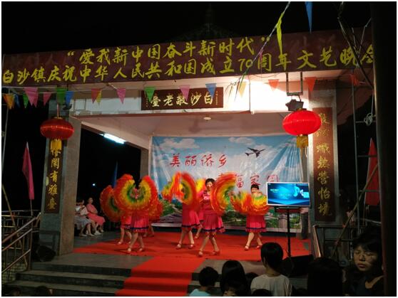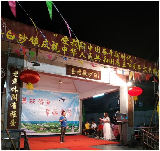 春華秋實70載,砥礪奮進再出發!為熱烈慶祝新中國成立70周年,深入推進“黨建統領,新中國”工作落實,宣傳、引導居民積極參與到新中國中,使新中國意識深入到每個居民家庭,營造歡樂祥和的節日氛圍,進一步擴大新時代文明實踐主題活動的覆蓋面和影響力,9月30日晚上,由白沙鎮主辦的 “愛我新中國 奮斗新時代” ——白沙鎮慶祝中華人民共和國成立70周年文藝晚會在白沙鎮白沙圩舉行。