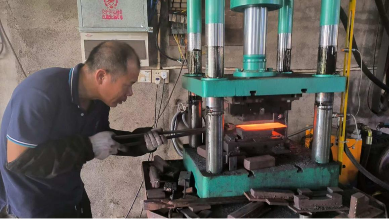 ▲黃偉文在使用鍛壓機對刀具進行塑性變形