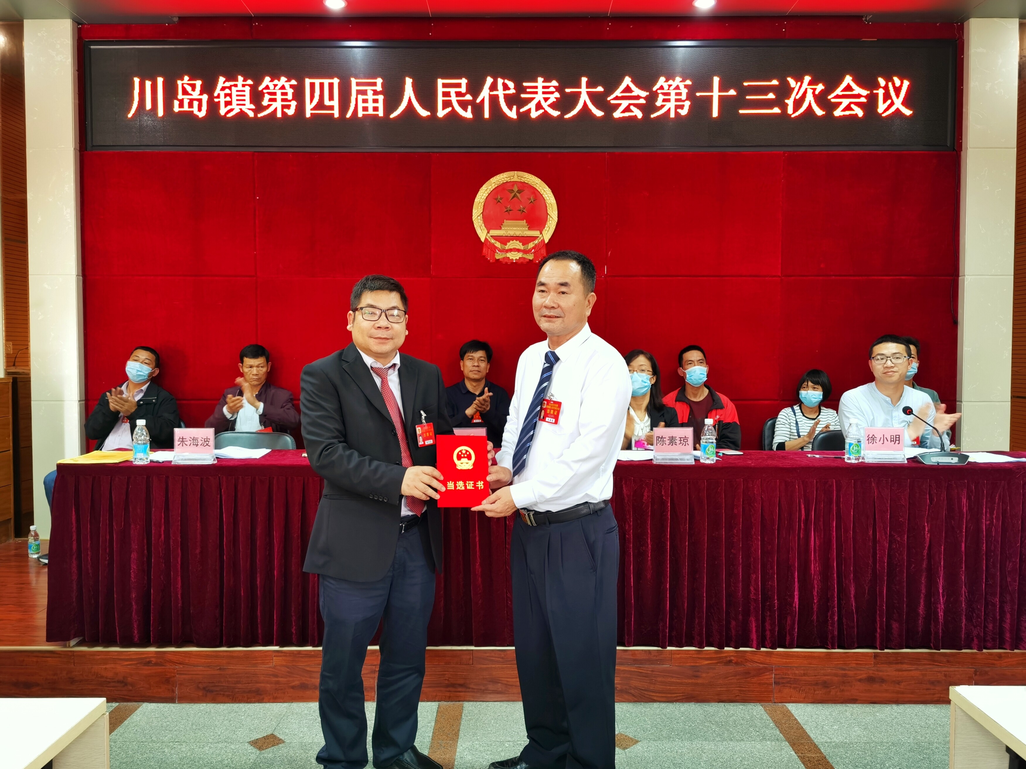 大會以無記名投票方式,選舉朱海波同志為我鎮人民代表大會主席。鎮黨委書記陳卓豪為新當選的鎮人大主席頒發當選證。朱海波在就職發言中表態:將以任職為新的起點,不忘初心、牢記使命、強化擔當、率先垂范,致力開創鎮人大工作新局面。