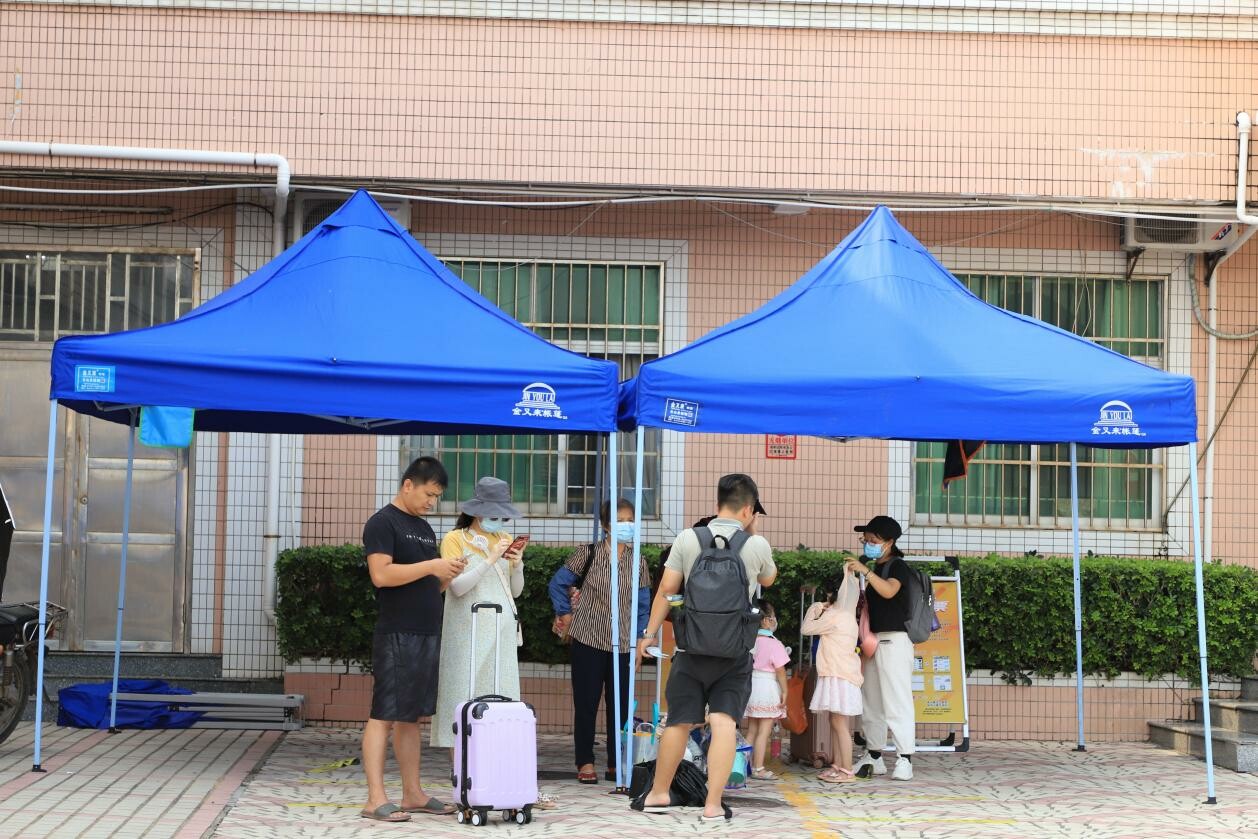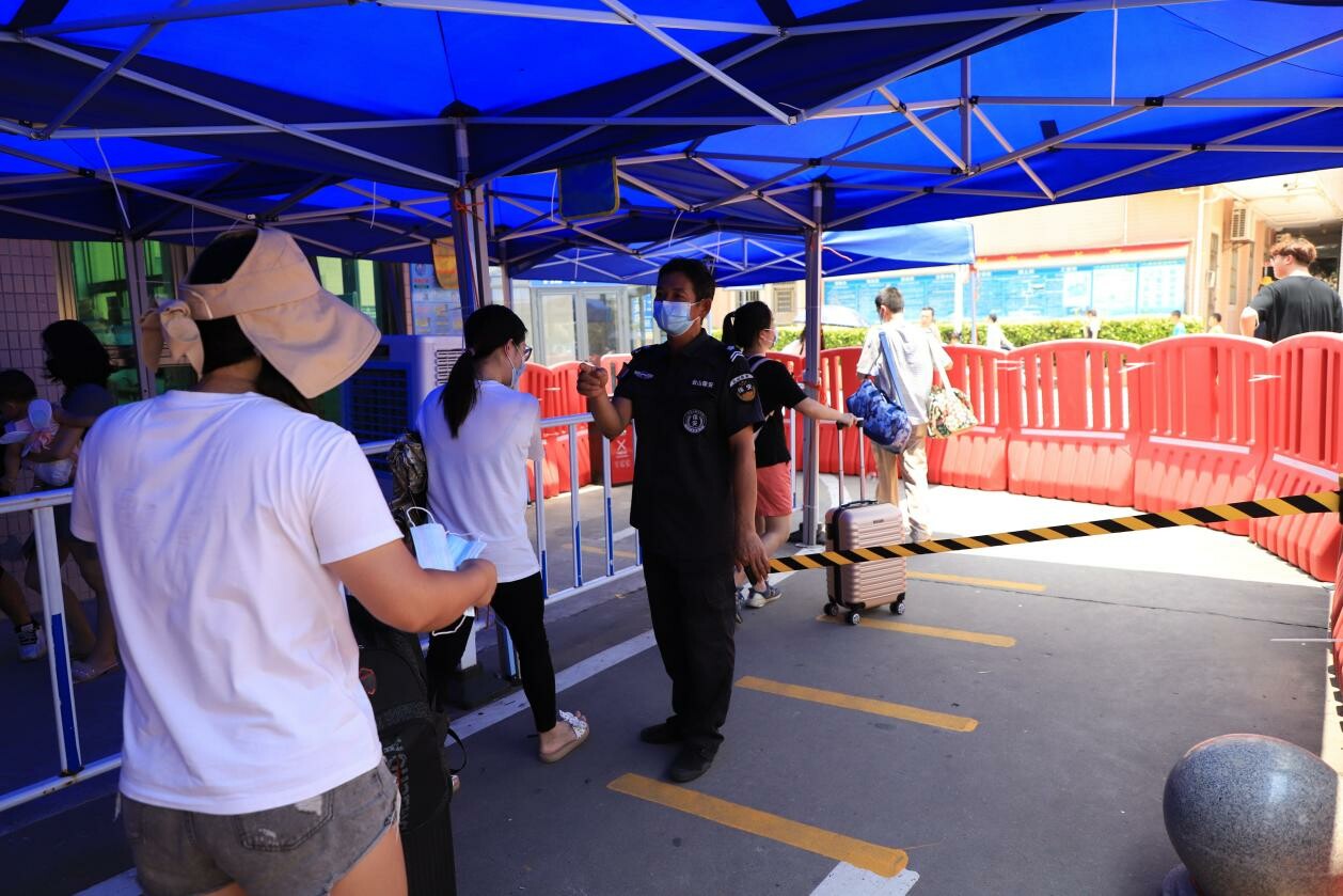 正在候船大廳前檢查粵康碼和行程碼的工作人員