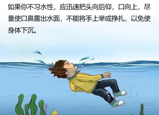 放松全身,讓身體漂浮在水面上,將頭部浮出水面,用腳踢水,防止體力喪失,等待救援;