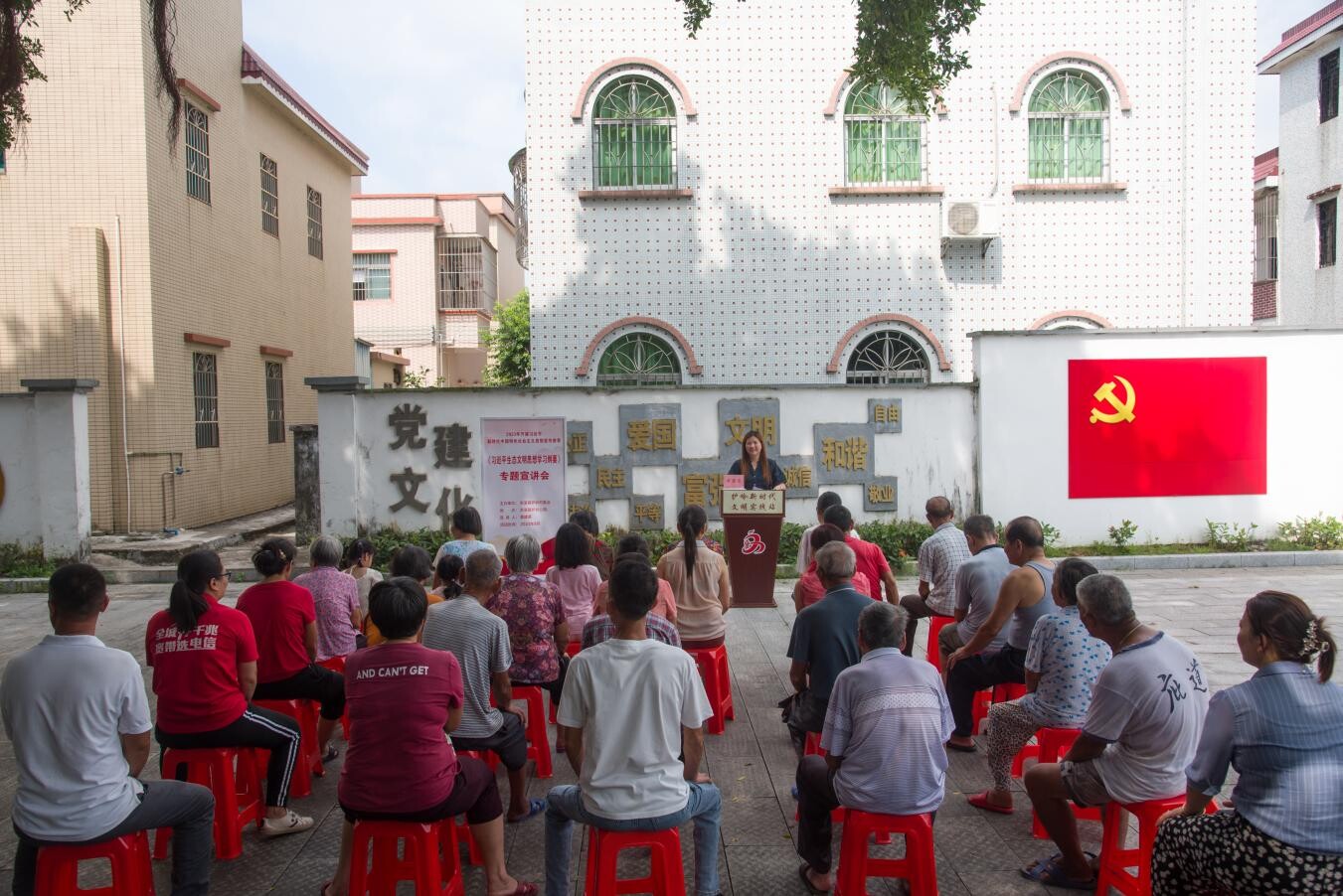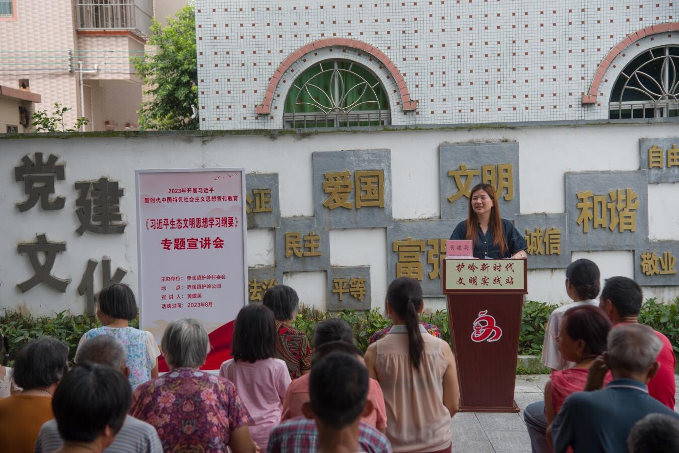 近日,在護嶺公園的黨建文化墻前,開展了一場以習近平新時代中國特色社會主義思想為主題的宣傳教育活動。護嶺村黨總支副書記黃建英作為宣講員,向村委會干部及群眾進行了《習近平生態文明思想學習綱要》的專題宣講。
