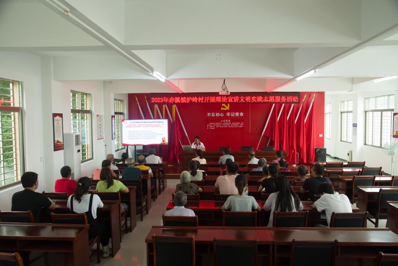 近日,赤溪鎮護嶺村在黨群服務中心內開展了一場理論宣講文明實踐志愿服務活動。本次活動以黨的創新理論大講堂的形式,講述了中國式現代化理論的意義與內涵,旨在深化群眾對中國式現代化理論的理解,提升群眾的思想素質和理論素養。