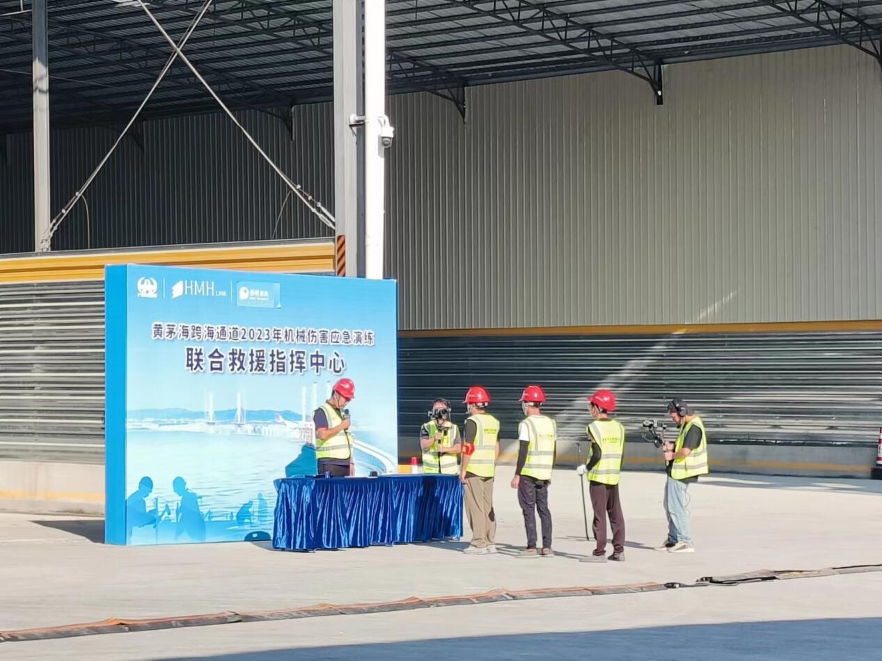 為檢驗赤溪鎮及保利長大工程有限公司部門間的聯動機制和項目部現場應對突發事故的實戰能力,在黃茅海跨海通道T10合同段瀝青拌和站現場,演練模擬了鏟車在冷料上料區作業后退時,不慎將從料倉口出來的工人碰撞倒地,造成工人一只腳被碾壓受傷的事故。事故發生后,參演人員啟動應急預案,按應急預案開展事故上報、事故現場警戒、現場應急處置和現場救治等規范化處置流程,經過各應急救援小組相互配合、緊張有序的救援,最后受傷人員被成功救出并送往醫院進行治療。