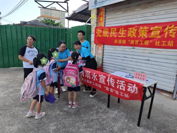 赤溪鎮社工站會定期舉辦未成年人保護法宣傳與未成年人預防溺水宣傳主題活動。活動通過發放宣傳單頁,向廣大民眾及青少年普及了未成年人保護法的核心內容及防溺水安全知識。“雙百”社工們一邊詳細講解了未成年人在何種情況下可以運用法律保護自己,強調遵紀守法的重要性;一邊詳細講解了水邊的危險性和溺水時的處理方法,增強青少年的防溺水意識與自救能力。活動現場互動熱烈,居民積極參與,有效提升了社區法治氛圍與安全意識,為未成年人的健康成長提供了堅實保障。