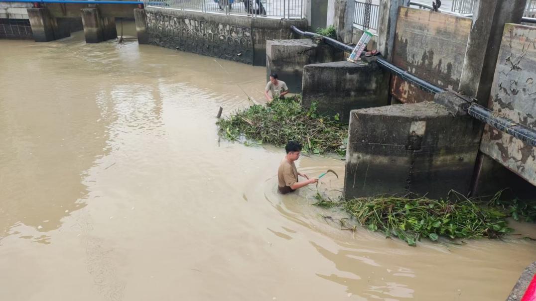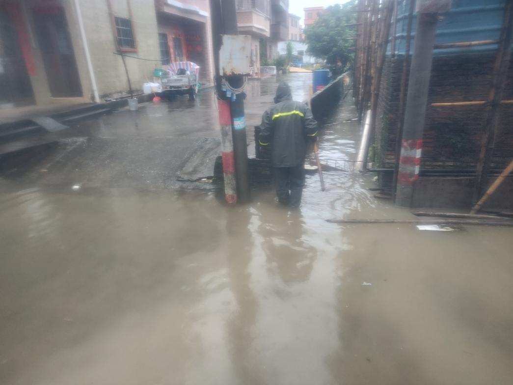 在圩鎮街道,鎮村干部和社區網格員逐個強化防洪排澇設施維護,及時疏通沙井、下水道口,加強排水。