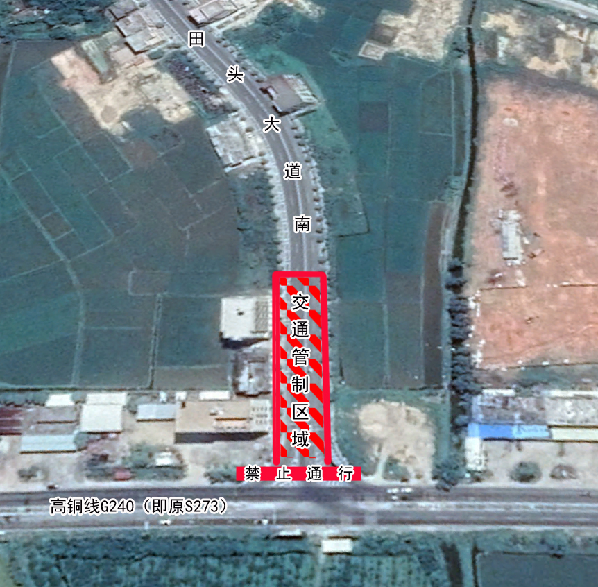 因赤溪鎮(zhèn)田頭圩生活污水處理站點管網(wǎng)西線施工建設(shè)需要,為確保施工期間行車安全和工程的順利,根據(jù)《中華人民共和國道路交通安全法》第三十九條的規(guī)定,我鎮(zhèn)決定在2019年3月28日中午12時至下午5時(工期約5小時),對高銅線G240(即原S273)K170+200和田頭大道南出口交界處(見下圖)路段實施臨時交通管制,禁止一切車輛和行人通行。交通管制期間可以由以下路線通行。