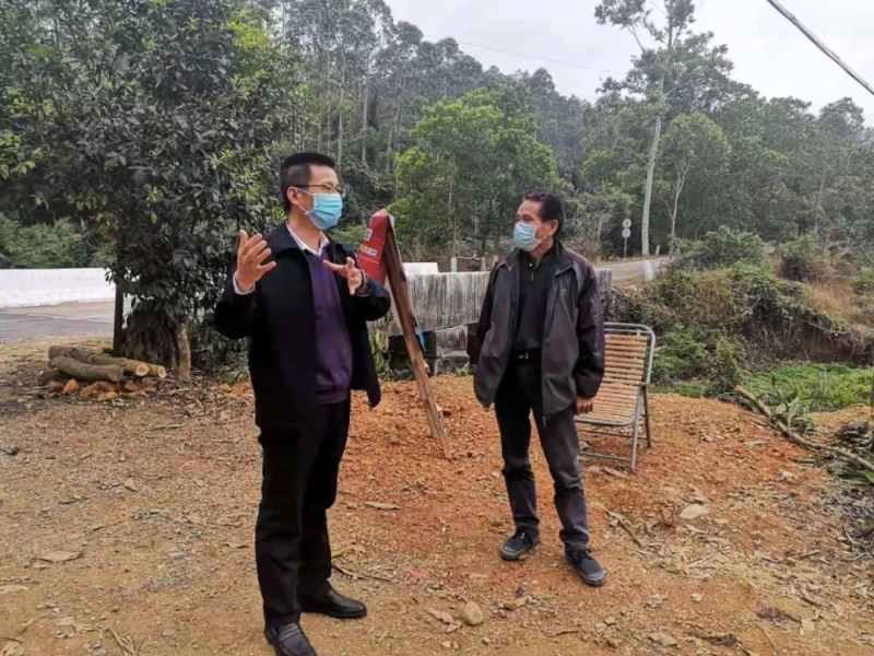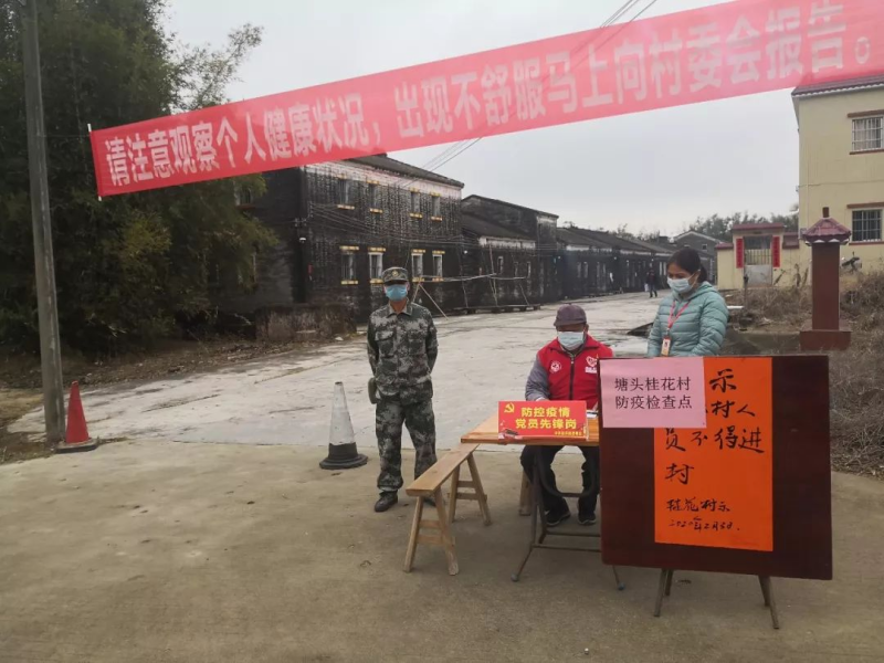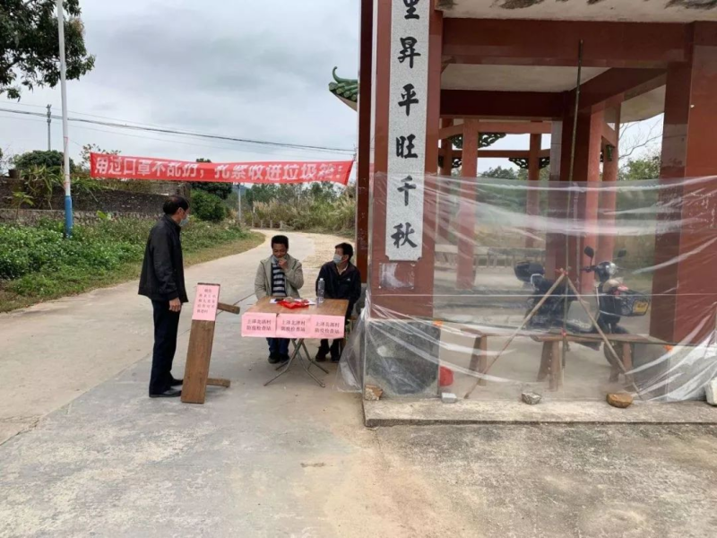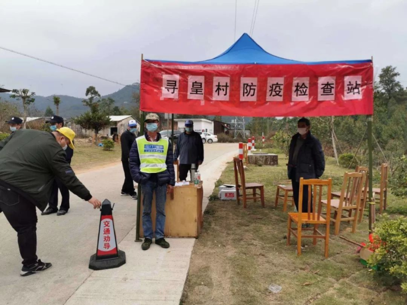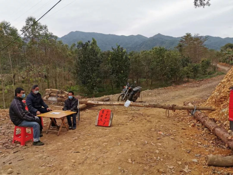 在缺乏物資的情況下,在大年初五,他就想到了一個土辦法:砍來了樹干,在入村的必經之路架起了一道閘,并把一段樹皮削掉,留下自己的電話號碼,以備不時之需,又找來一張紅紙,寫下“非常時期,非本村人嚴禁進入”,貼在一塊石頭上,立在閘口邊,就這樣,許優盛就地取材建起了隆文村委會第一個疫情防控檢查點。
