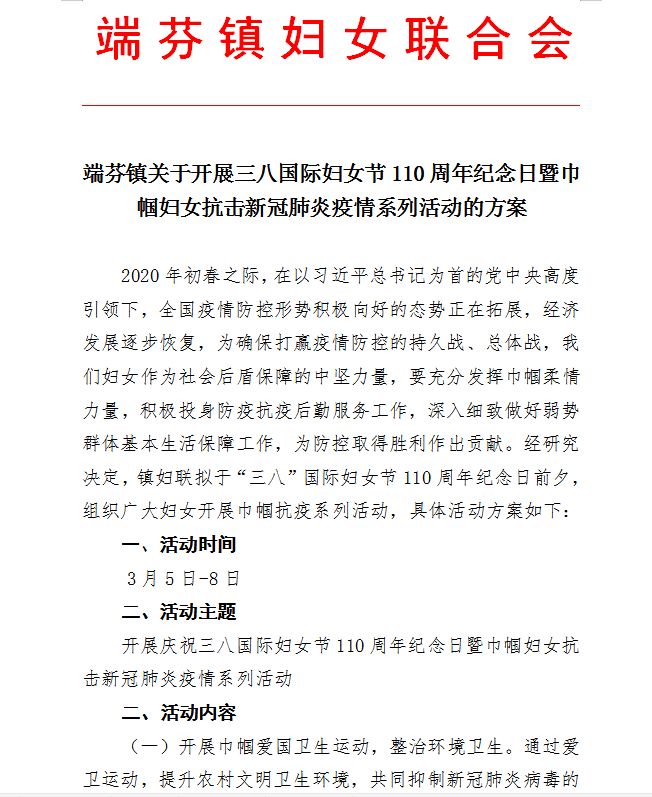 端芬鎮(zhèn)婦聯(lián)印發(fā)“三八”婦女節(jié)系列活動(dòng)方案