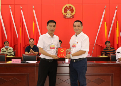 鎮黨委書記李益新為歐堅彪頒發當選證