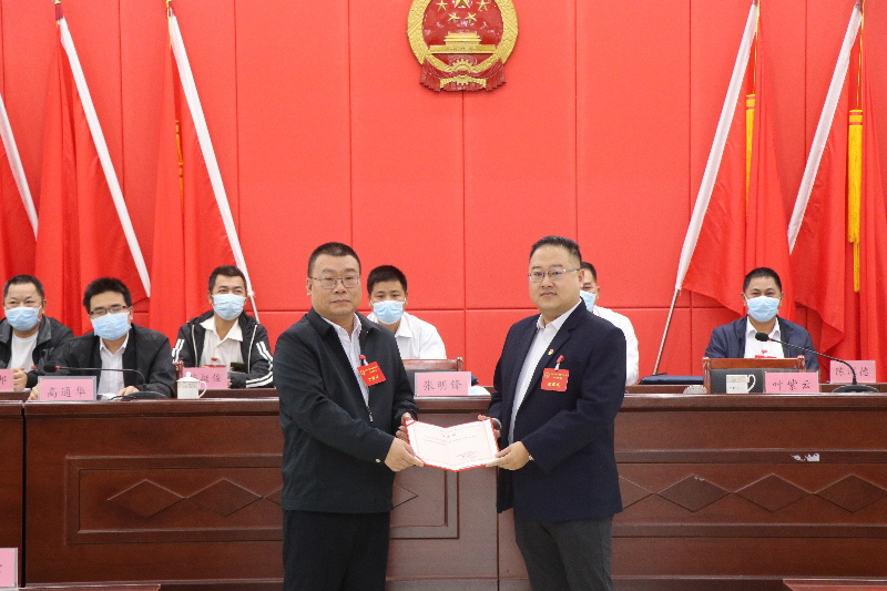 鎮(zhèn)黨委書(shū)記張明鋒為新當(dāng)選的副鎮(zhèn)長(zhǎng)頒發(fā)當(dāng)選證