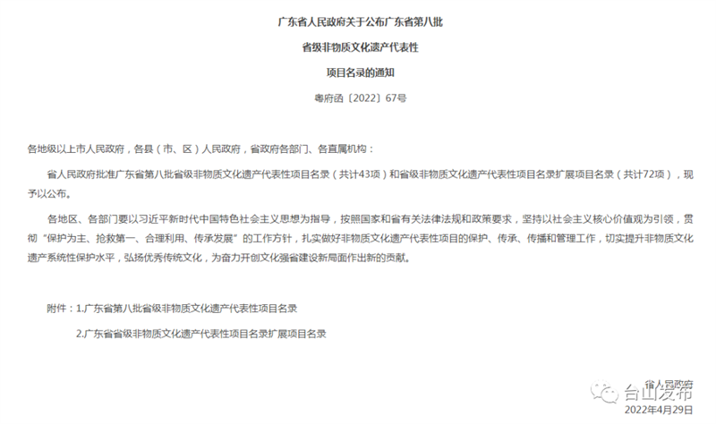 本次省人民政府共批準廣東省第八批省級非物質文化遺產代表性項目名錄43項,省級非物質文化遺產代表性項目名錄擴展項目名錄72項。此次我市入選的九人排球項目屬于傳統體育、游藝與雜技類。到目前為止,我市非遺項目國家級2項,省級3項,江門市級13項,臺山市級18項。
