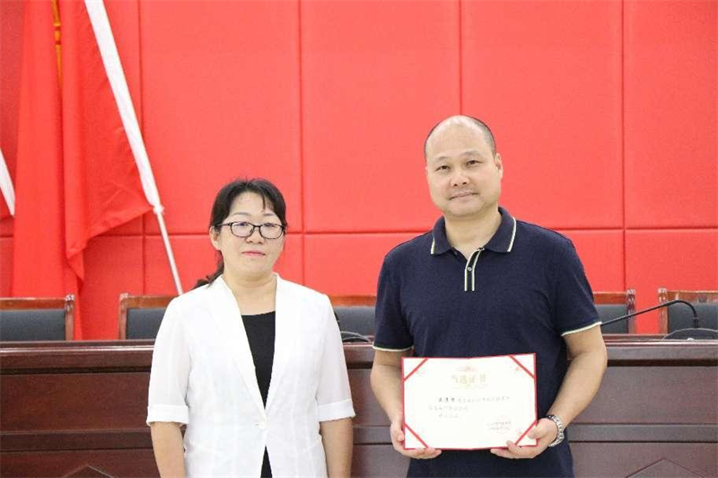△鎮黨委副書記黃麗新向新當選的第五屆端芬鎮商會會長丘清君頒發當選證書