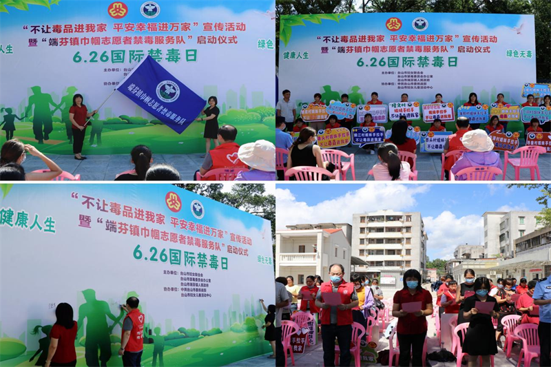 為進(jìn)一步加強(qiáng)毒品預(yù)防宣傳工作,提高廣大群眾的防毒、拒毒意識(shí),增強(qiáng)家庭成員防范和抵御毒品能力,在國(guó)際禁毒日到來之際,6月24日,由臺(tái)山市婦女聯(lián)合會(huì)、臺(tái)山市禁毒委員會(huì)辦公室、臺(tái)山市端芬鎮(zhèn)人民政府主辦,中共臺(tái)山市委統(tǒng)戰(zhàn)部、臺(tái)山市婦女兒童活動(dòng)中心協(xié)辦的“不讓毒品進(jìn)我家 平安幸福進(jìn)萬家”系列宣傳活動(dòng)在端芬鎮(zhèn)端芬圩社區(qū)新時(shí)代文明實(shí)踐站舉行。動(dòng)員廣大群眾和家庭成員支持、參與禁毒工作,掀起禁毒宣傳熱潮。