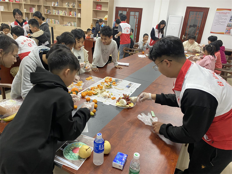 志愿者為孩子們準備了葡萄、柚子、蘋果、橙子、香蕉等顏色各異、形狀不同的水果,組織孩子們進行水果拼盤設計,動員小朋友們發揮創意、大膽嘗試,設計出獨一無二的水果拼盤。“水果花”、“水果樹”、“水果八卦圖”···孩子們的創意天馬行空,不拘泥于傳統的水果拼盤樣式。在水果拼盤活動中,通過對水果的巧妙搭配,既讓孩子們度過了愉快的下午茶時光,也培養了孩子們的審美情趣和動手能力。