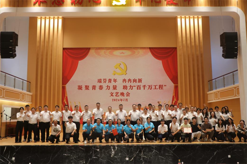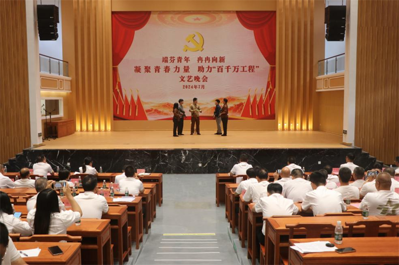 晚會圍繞“高舉旗,堅定初心”“踏征程,奮勇前進”“新時代,建功立業(yè)”三個篇章展開,通過合唱、獨唱、小品、朗誦等多種形式進行。節(jié)目演出期間還進行了“百千萬工程”知識問答互動,進一步提升青年對“百千萬工程”政策的認(rèn)識,營造良好的宣傳氛圍。為進一步展現(xiàn)青年良好精神風(fēng)貌,推進“百千萬工程”高質(zhì)量,貢獻青春力量。7月,由端芬鎮(zhèn)團委牽頭在鎮(zhèn)委黨校隆文分校舉辦“凝聚青春力量 助力‘百千萬工程’”文藝晚會。