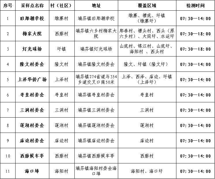 根據疫情防控需要,為及時發現和阻斷疫情傳播鏈條,防范疫情輸入風險,根據市、鎮新冠肺炎防控指揮部統一部署,決定于10月10日對端芬鎮常住人口及臨時來端芬人員開展免費核酸檢測。現將有關事項通告如下: