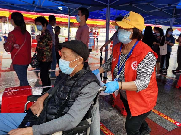 (廣海城社區(qū)黨員,退休干部楊燕珠為老人家推輪椅,幫助其進(jìn)行核酸檢測(cè))