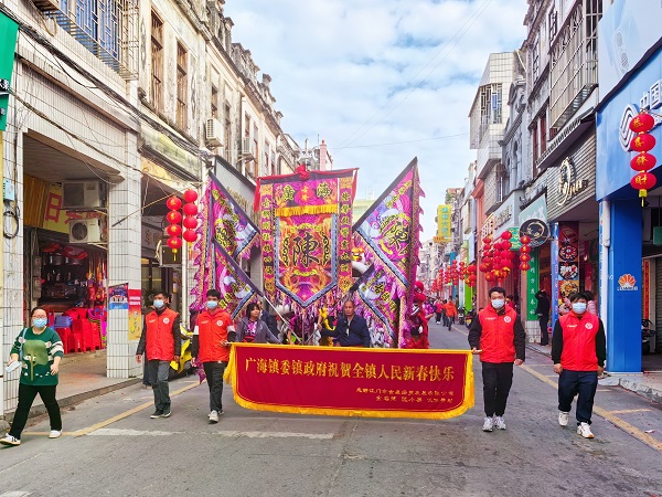 瑞獅賀春巡游路線自廣海鎮府至廣海漁港碼頭。上午9時,在群眾的翹首以盼中,醒獅隊伍開始巡游,他們過街串巷,踩著威風凜凜、精神十足的步伐,以喜慶歡騰的醒獅向全鎮居民群眾拜年,祈求廣大居民在新一年各項事業蒸蒸日上,事事順利!沿途不斷有群眾加入觀看隊伍,端的是一派歡騰喜悅的景象!