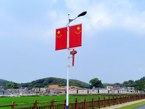 ▲鄉(xiāng)村路邊懸掛國旗和中國結(jié)