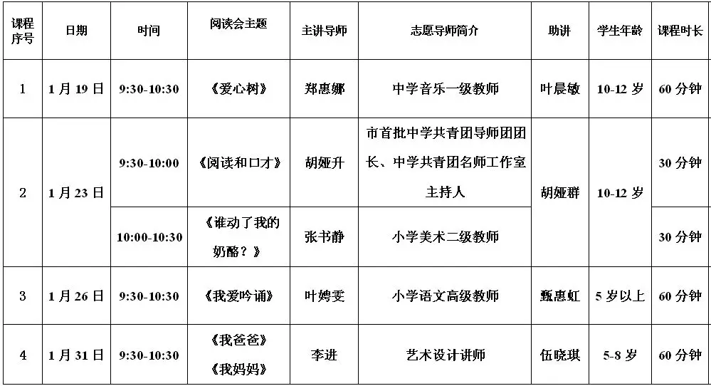 這次的寒假閱讀會,我們一共安排了四次課程、五個故事,大家可以根據自己的需要選擇喜歡的課程報名。