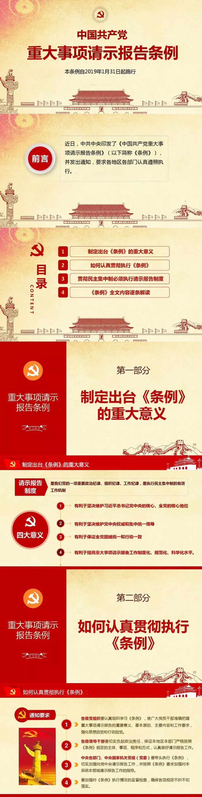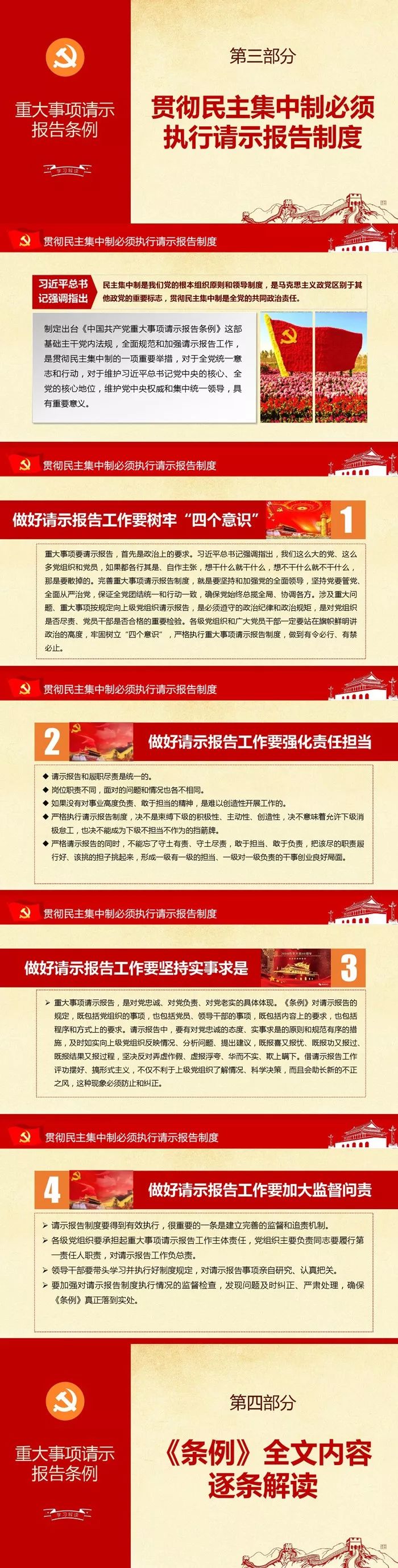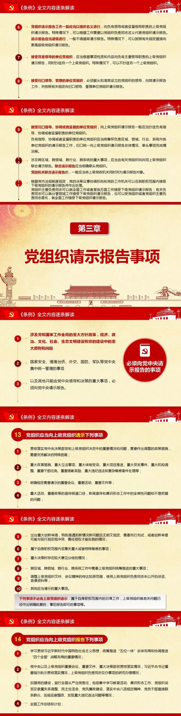 近日,中共中央印發的《中國共產黨重大事項請示報告條例》全文公布,為開展黨內請示報告工作提供了基本遵循。黨組織、黨員、領導干部的哪些事項需要請示報告?向誰請示報告?怎么請示報告?一圖讀懂↓↓↓