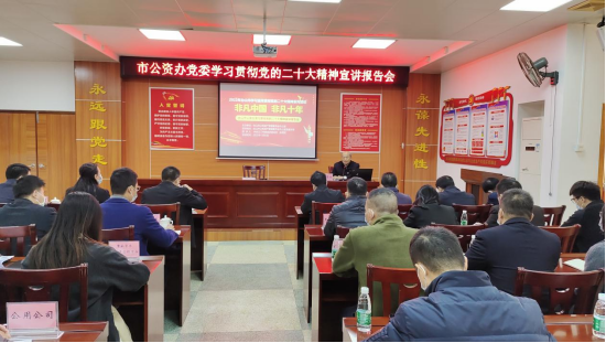 市公資辦黨委高度重視黨的二十大精神宣講工作。在全國上下深入學習宣傳貫徹黨的二十大精神之際,牢牢把握學習宣傳貫徹的工作要求,深入貫徹落實臺山市“學習貫徹黨的二十大精神宣講動員會暨集體備課會”部署要求,第一時間召開專題會議,對市屬國有企業開展學習貫徹黨的二十大精神宣講工作進行研究部署。研究制定《市公資辦黨委學習宣傳貫徹黨的二十大精神宣講活動方案》,對宣講重點、宣講安排、宣講要求等方面作出了明確指示,將學習宣傳貫徹工作向縱深推進。組建“學習貫徹黨的二十大精神市公資辦黨委宣講團”,由黨委書記擔任組長,黨委領導班子成員及下屬企業黨組織書記為宣講團成員,下設辦公室在人秘股(黨委辦)。組織召開動員會,引導市屬國有企業廣大黨員干部職工深刻領悟“兩個確立”的決定性意義,增強“四個意識”、堅定“四個自信”、做到“兩個維護”,自覺把思想和行動統一到黨的二十大精神上來,在學深悟透中增強投身國有企業發展的信心和決心。