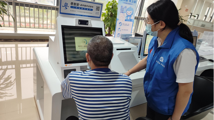 在社保經辦大廳網辦專區,社保黨員志愿者指引群眾通過“粵智助”辦理社保業務