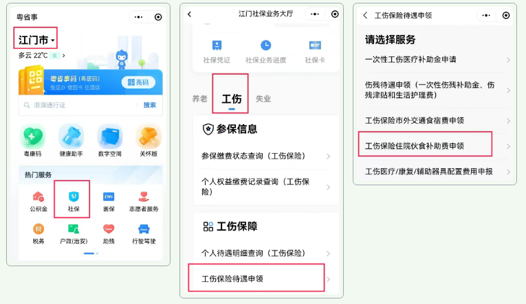 第一步:打開微信“粵省事”小程序,選擇城市為“江門”并認證登錄后,選擇【社保·就業】服務模塊,點擊【工傷】→【工傷保險待遇申領】→【工傷保險住院伙食補助費申領】。