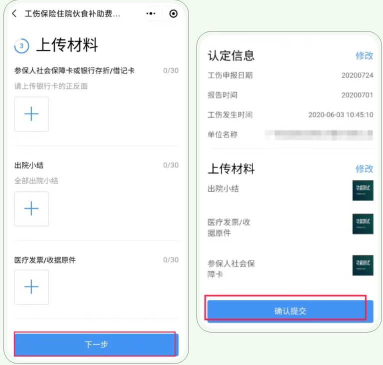 第四步:按提示上傳醫療發票/收據、出院小結、參保人社會保障卡,并點擊【下一步】按鈕,核對信息無誤后點擊【確認提交】。